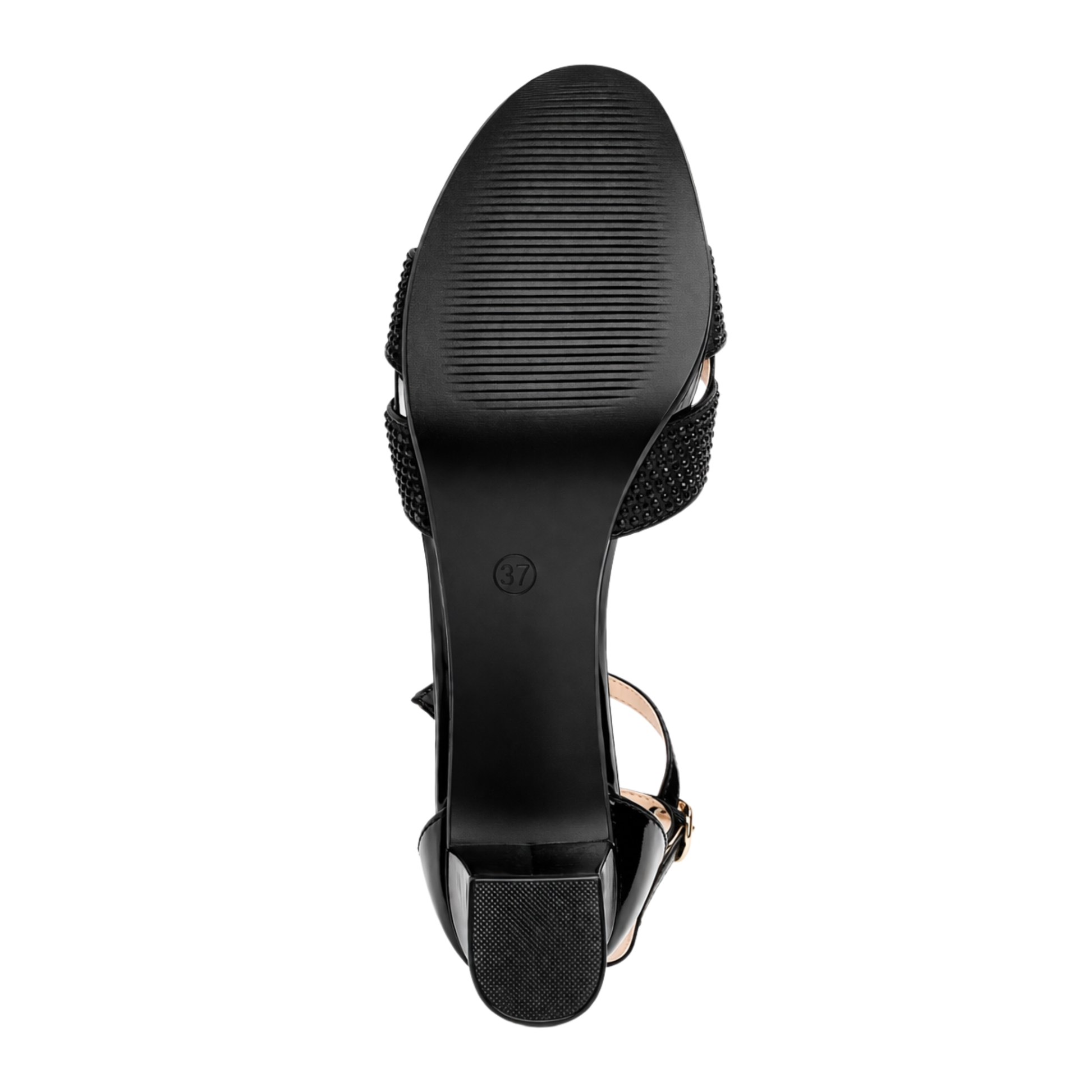Sandalo elegante con fasce incrociate e strass, tacco largo e cinturino regolabile.